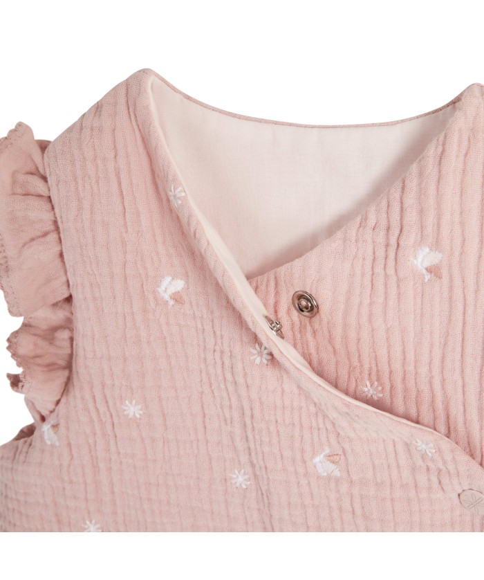 Gigoteuse 1er âge en double gaze de coton, brodée. La doublure est en voile de coton bio et rembourrage 100% polyester recyclé.