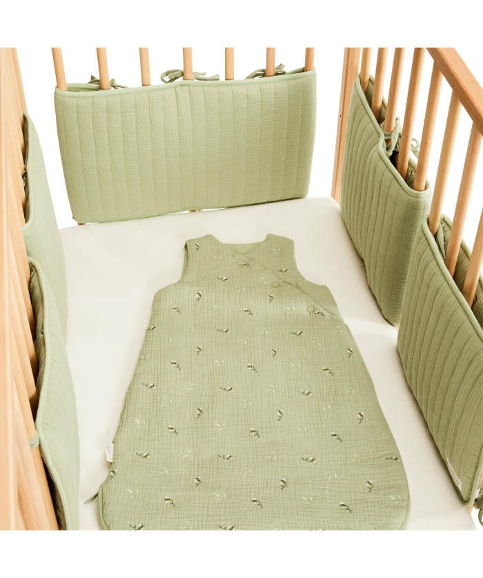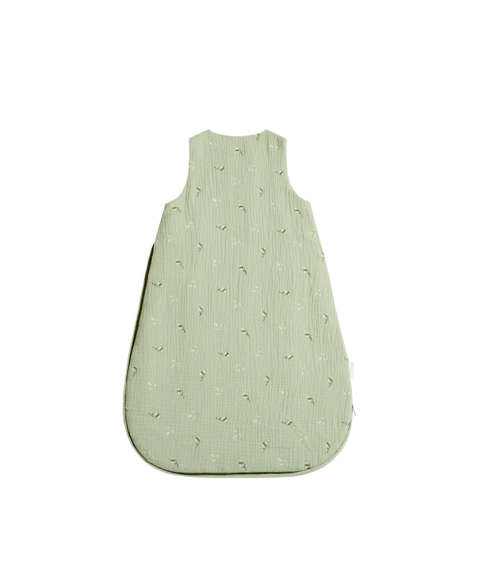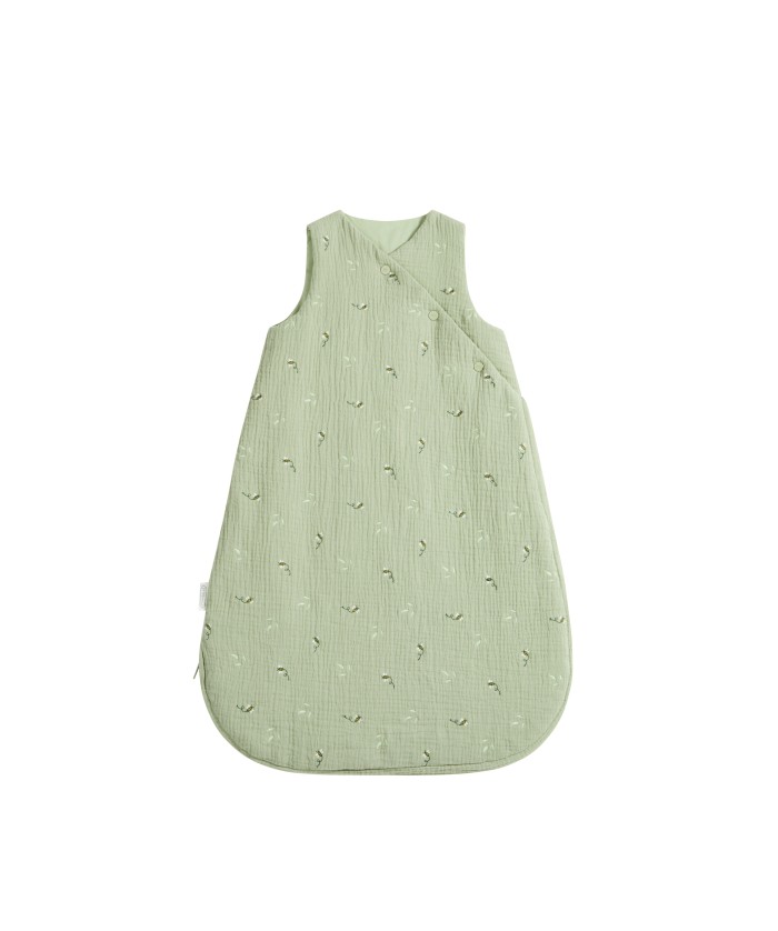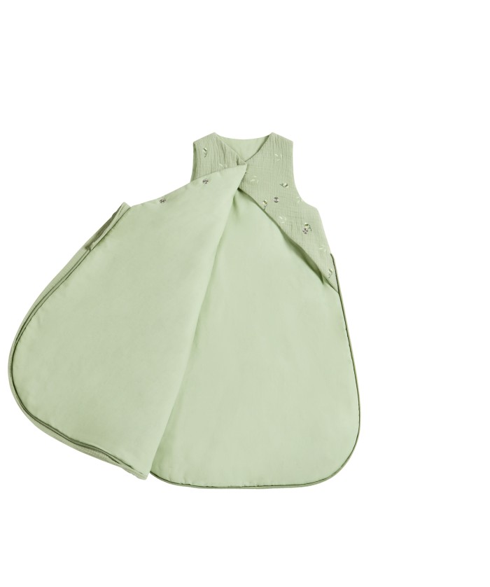 Gigoteuse 1er âge en double gaze de coton, brodée. La doublure est en voile de coton bio et rembourrage 100% polyester recyclé.