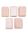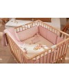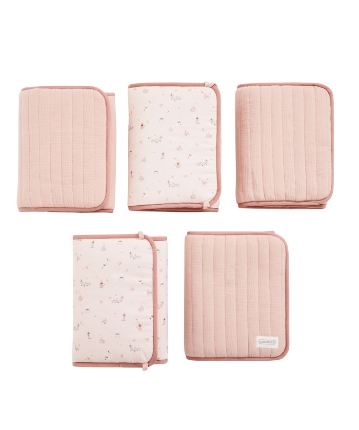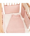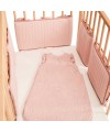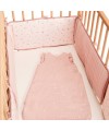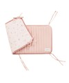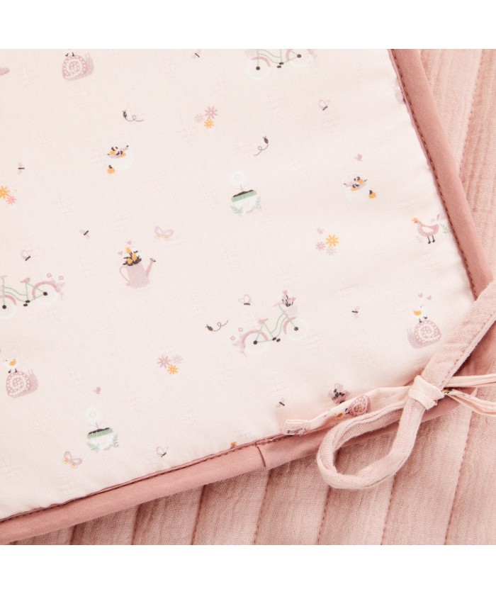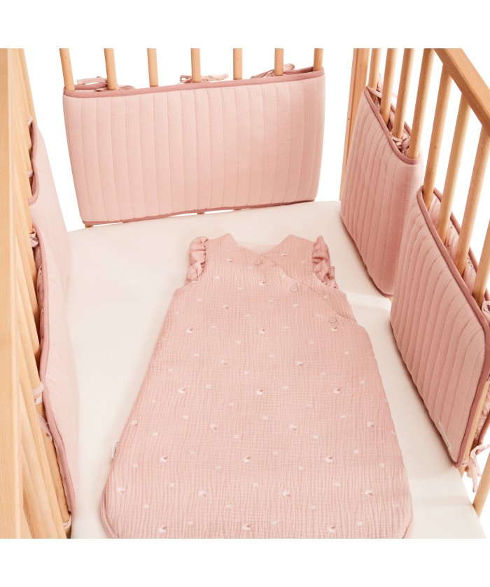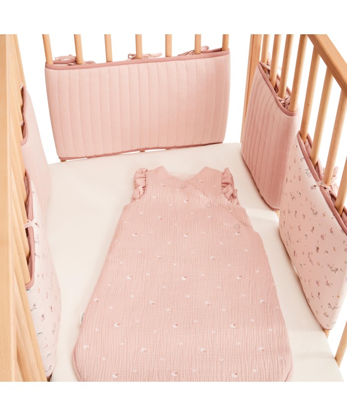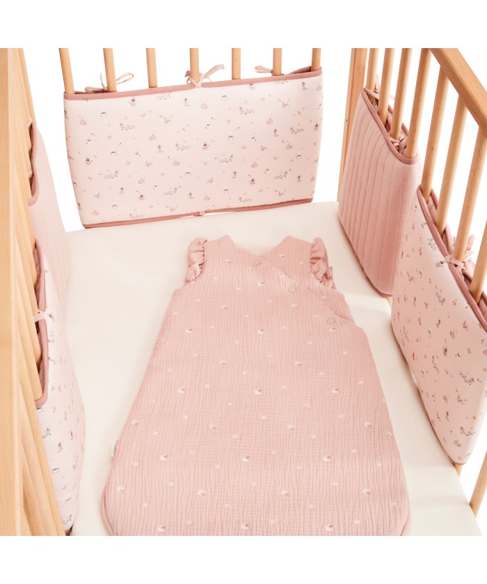 Lot de 5 protèges barreaux réversibles en gaze de coton bio rose clair avec motifs bucoliques.
