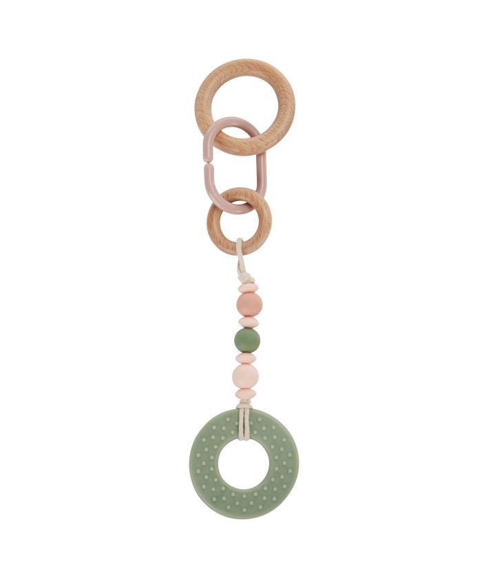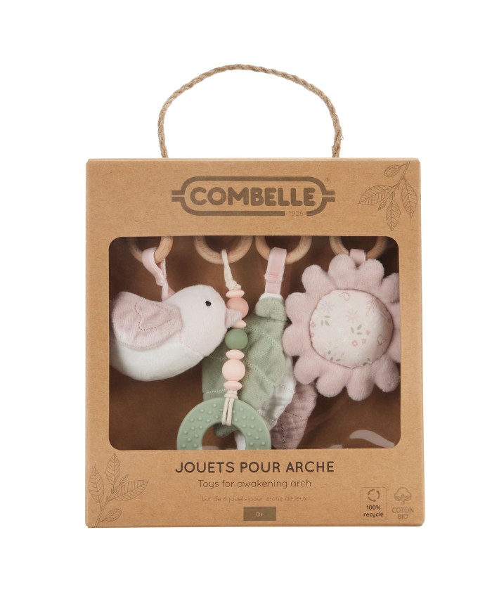 Joli set d'activité pour arche de jeux, composé de 4 jouets à suspendre. Promenade bucolique rose.