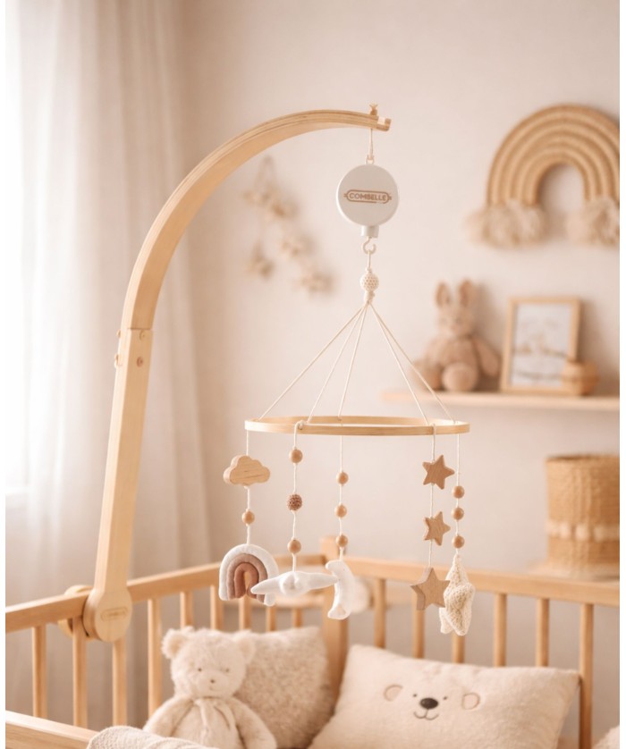 Facilite le sommeil de bébé et se fixe facilement aux barreaux du lit. Boîte à musique sans pile avec bouton ON/OFF et peluches et jouets inclus.