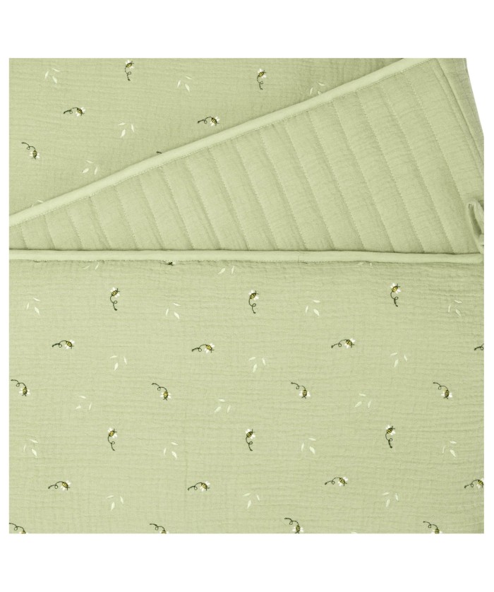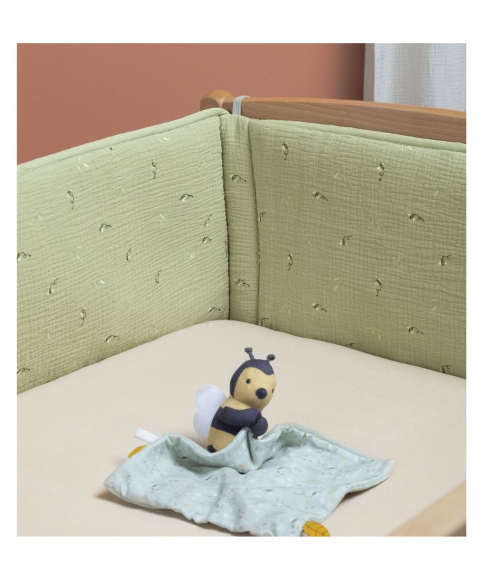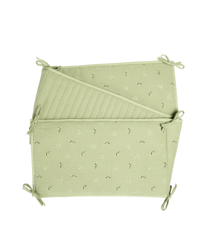 Tour de lit imprimé en gaze de coton bio vert clair de la collection Promenade Bucolique pour apporter de la douceur aux nuits de bébé.