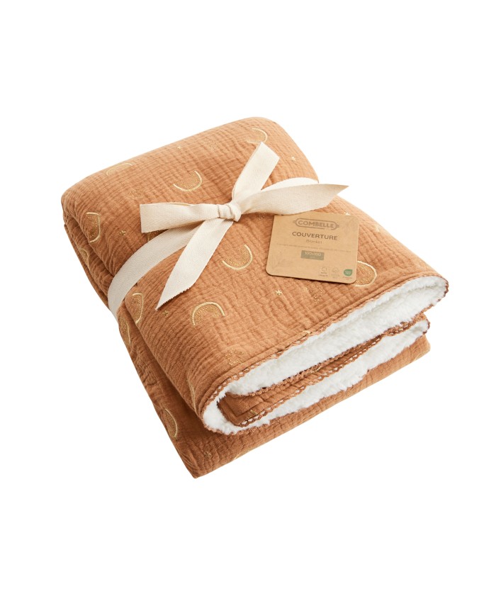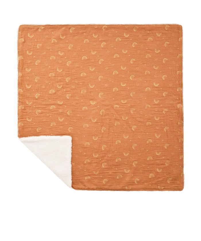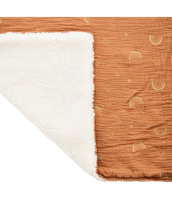 - Douce couverture réversible pour garder bébé au chaud, en double gaze de coton BIO. Broderie et Sherpa Polyester.