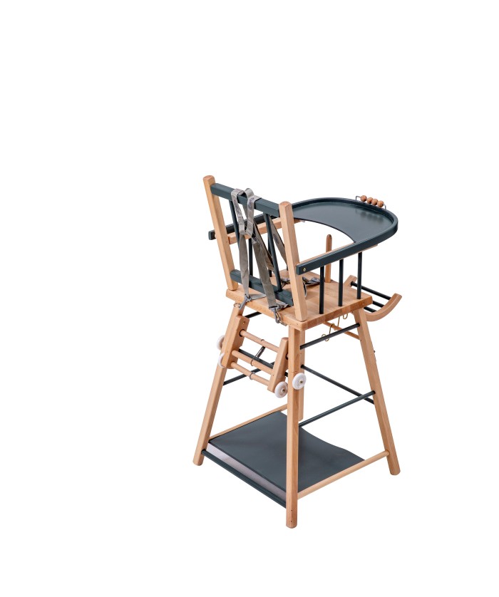 Pour faire patienter bébé, un petit boulier est incorporé à la tablette en bois courbée. Le repose-pied en bois également, ajoute du confort pour l’assise de bébé.