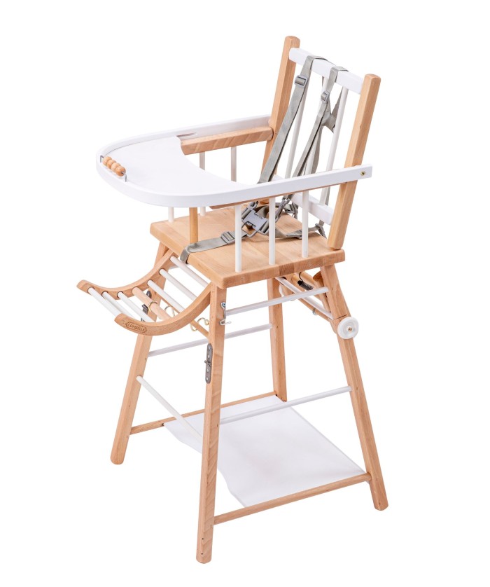 Pour faire patienter bébé, un petit boulier est incorporé à la tablette en bois courbée. Le repose-pied en bois également, ajoute du confort pour l’assise de bébé.