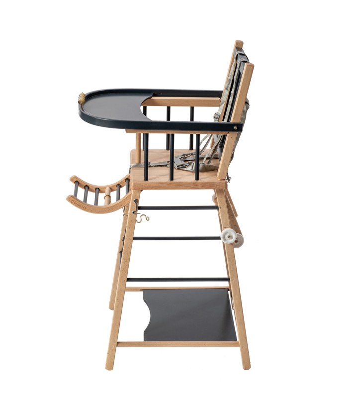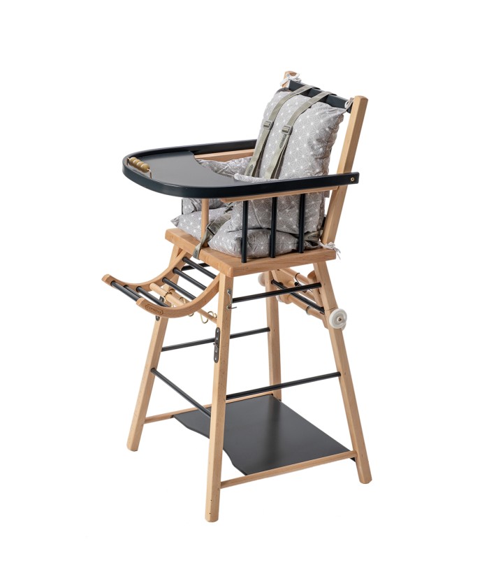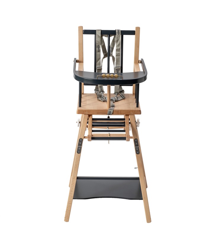 Pour faire patienter bébé, un petit boulier est incorporé à la tablette en bois courbée. Le repose-pied en bois également, ajoute du confort pour l’assise de bébé.