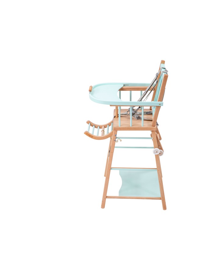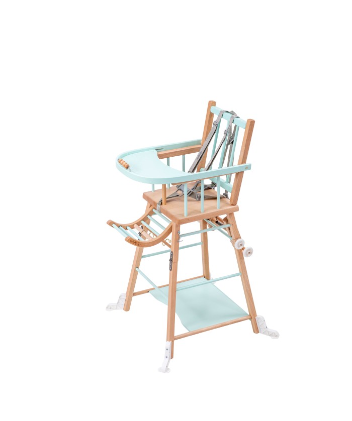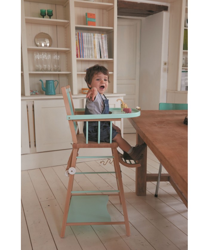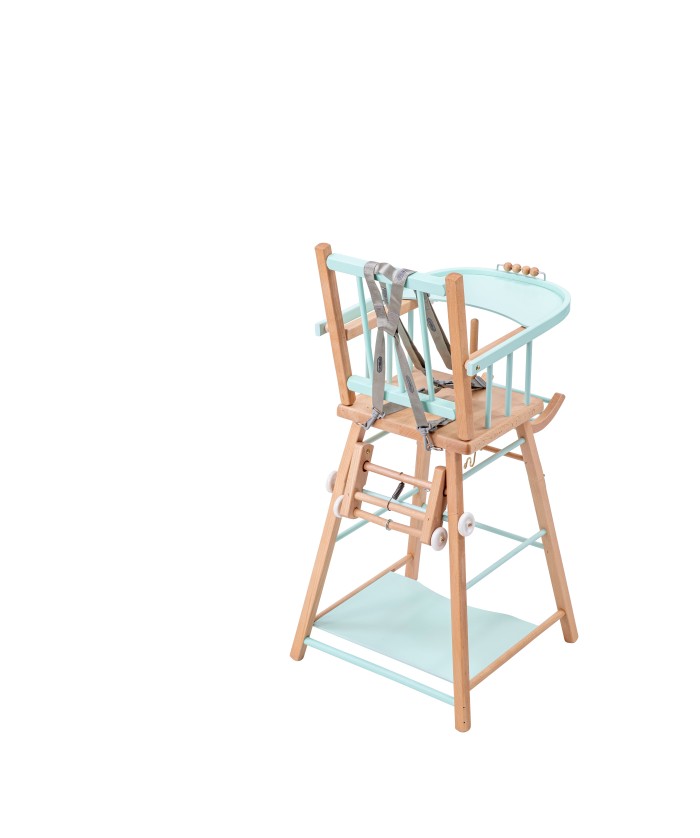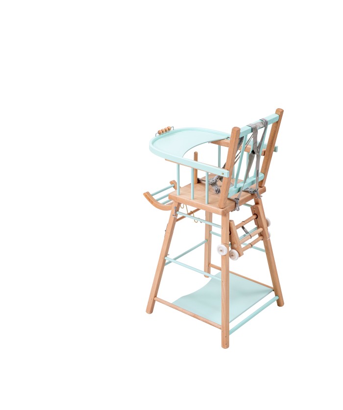 Pour faire patienter bébé, un petit boulier est incorporé à la tablette en bois courbée. Le repose-pied en bois également, ajoute du confort pour l’assise de bébé.