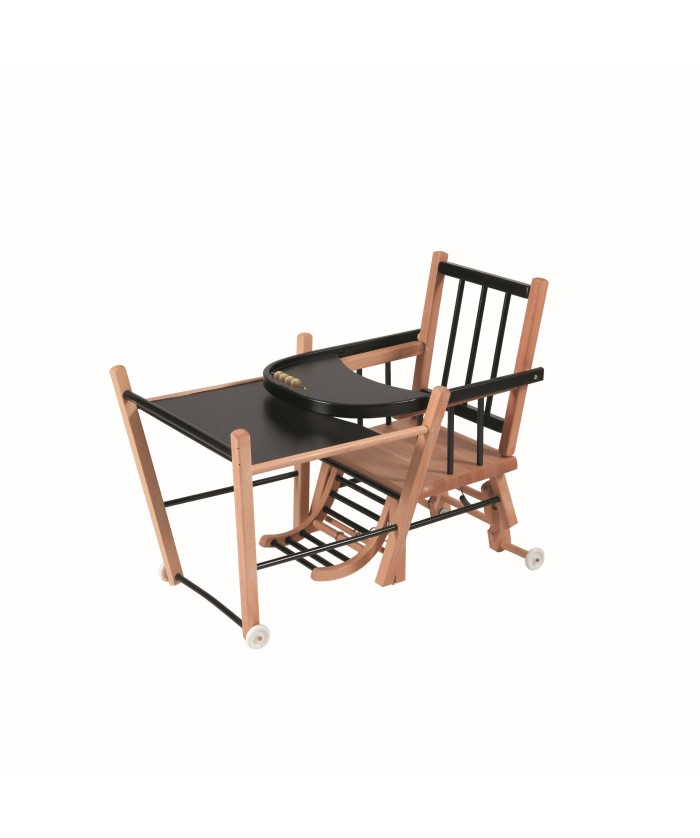 Pour faire patienter bébé, un petit boulier est incorporé à la tablette en bois courbée. Le repose-pied en bois également, ajoute du confort pour l’assise de bébé.