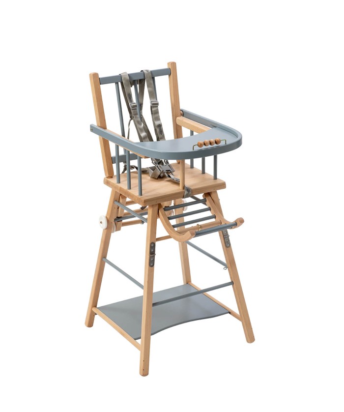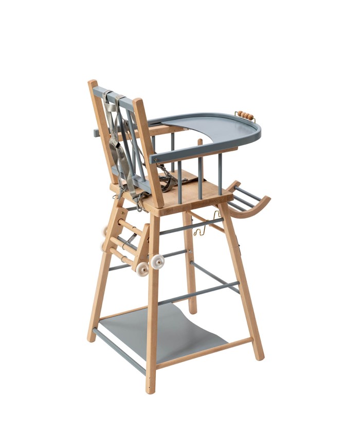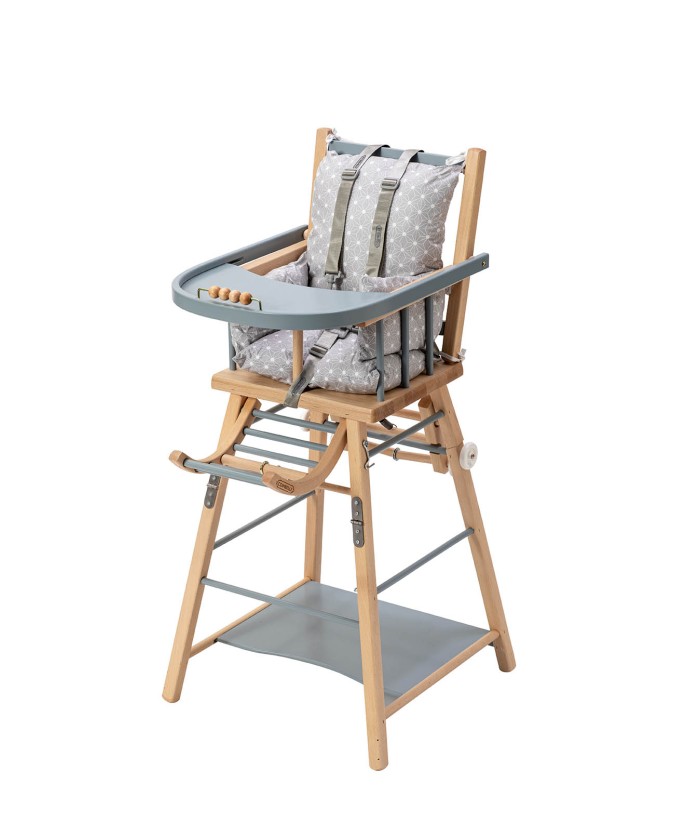 Pour faire patienter bébé, un petit boulier est incorporé à la tablette en bois courbée. Le repose-pied en bois également, ajoute du confort pour l’assise de bébé.