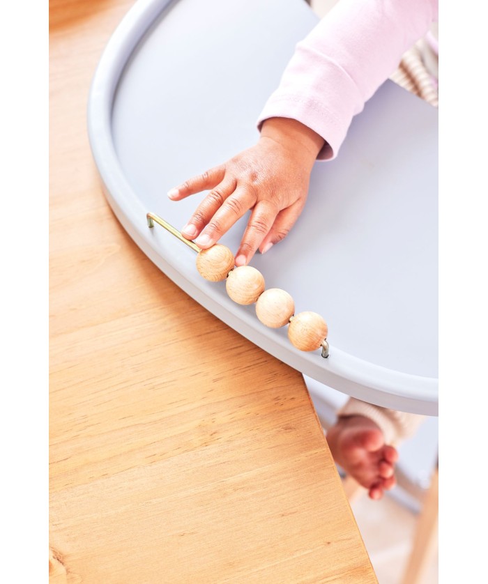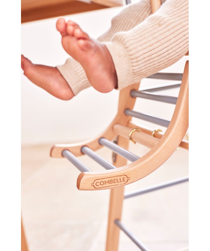 Sur la tablette en bois Combelle a eu la très bonne idée de placer un petit boulier pour amuser bébé ou le faire patienter le temps que son repas soit prêt. Côté confort, bébé pourra reposer ses pieds sur le repose-pieds réglable en bois courbé, une bonne installation pour manger est indispensable.