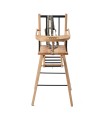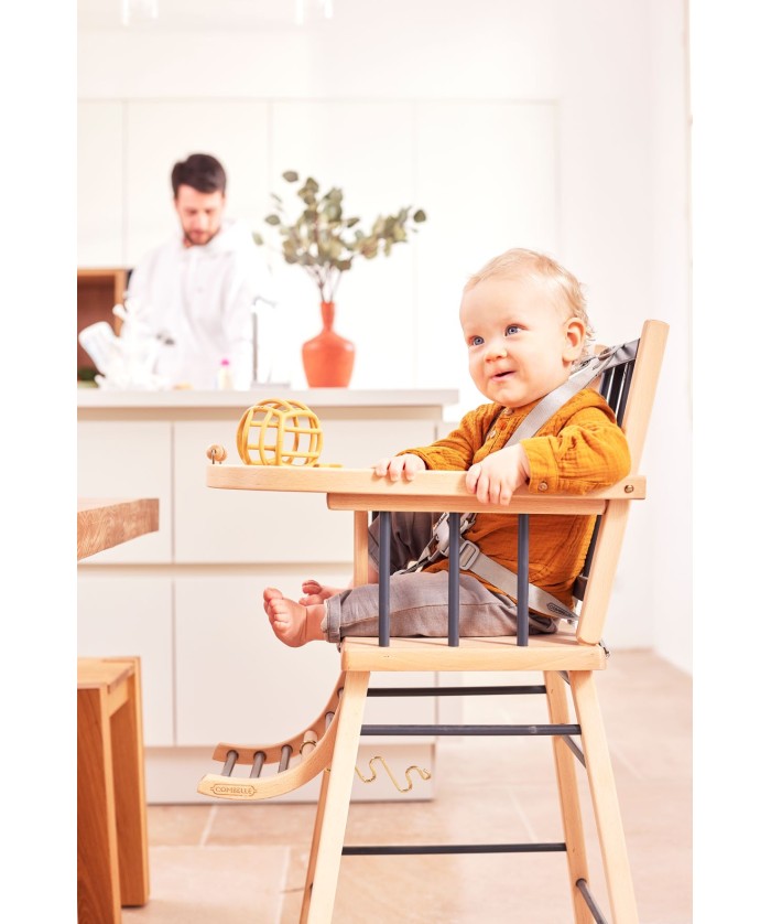 Sur la tablette en bois Combelle a eu la très bonne idée de placer un petit boulier pour amuser bébé ou le faire patienter le temps que son repas soit prêt. Côté confort, bébé pourra reposer ses pieds sur le repose-pieds réglable en bois courbé, une bonne installation pour manger est indispensable.