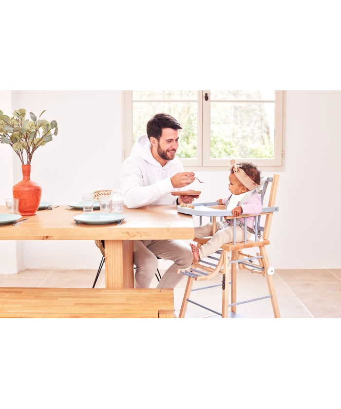 Sur la tablette en bois Combelle a eu la très bonne idée de placer un petit boulier pour amuser bébé ou le faire patienter le temps que son repas soit prêt. Côté confort, bébé pourra reposer ses pieds sur le repose-pieds réglable en bois courbé, une bonne installation pour manger est indispensable.