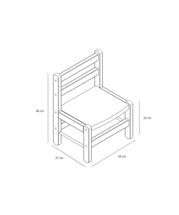 La chaise basse mesure 33 cm de largeur, 27 cm de longueur et 46 cm de hauteur. L’assise est située à 23 cm du sol. Nos experts considèrent que cette hauteur d’assise est parfaite pour bébé.