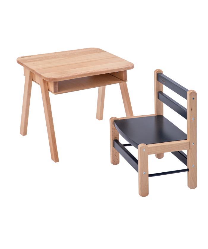 CARACTÉRISTIQUES : Bureau. Essence : hêtre massif, Finition : vernis naturel. Plateau : Hêtre massif. Dimensions : 49 cm x 39 cm, hauteur 42.5 cm. Charge maximale admissible sur le plateau : 30 kg. Chaise : pour enfant de 10 mois à 5 ans. Dimensions 27x33, hauteur 46cm. Essence : Hêtre massif. Charge maximale admissible sur la chaise : 20 kg