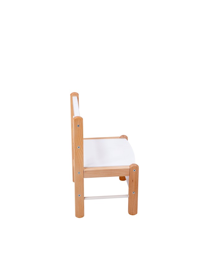CARACTÉRISTIQUES : Bureau. Essence : hêtre massif, Finition : vernis naturel. Plateau : Hêtre massif. Dimensions : 49 cm x 39 cm, hauteur 42.5 cm. Charge maximale admissible sur le plateau : 30 kg. Chaise : pour enfant de 10 mois à 5 ans. Dimensions 27x33, hauteur 46cm. Essence : Hêtre massif. Charge maximale admissible sur la chaise : 20 kg