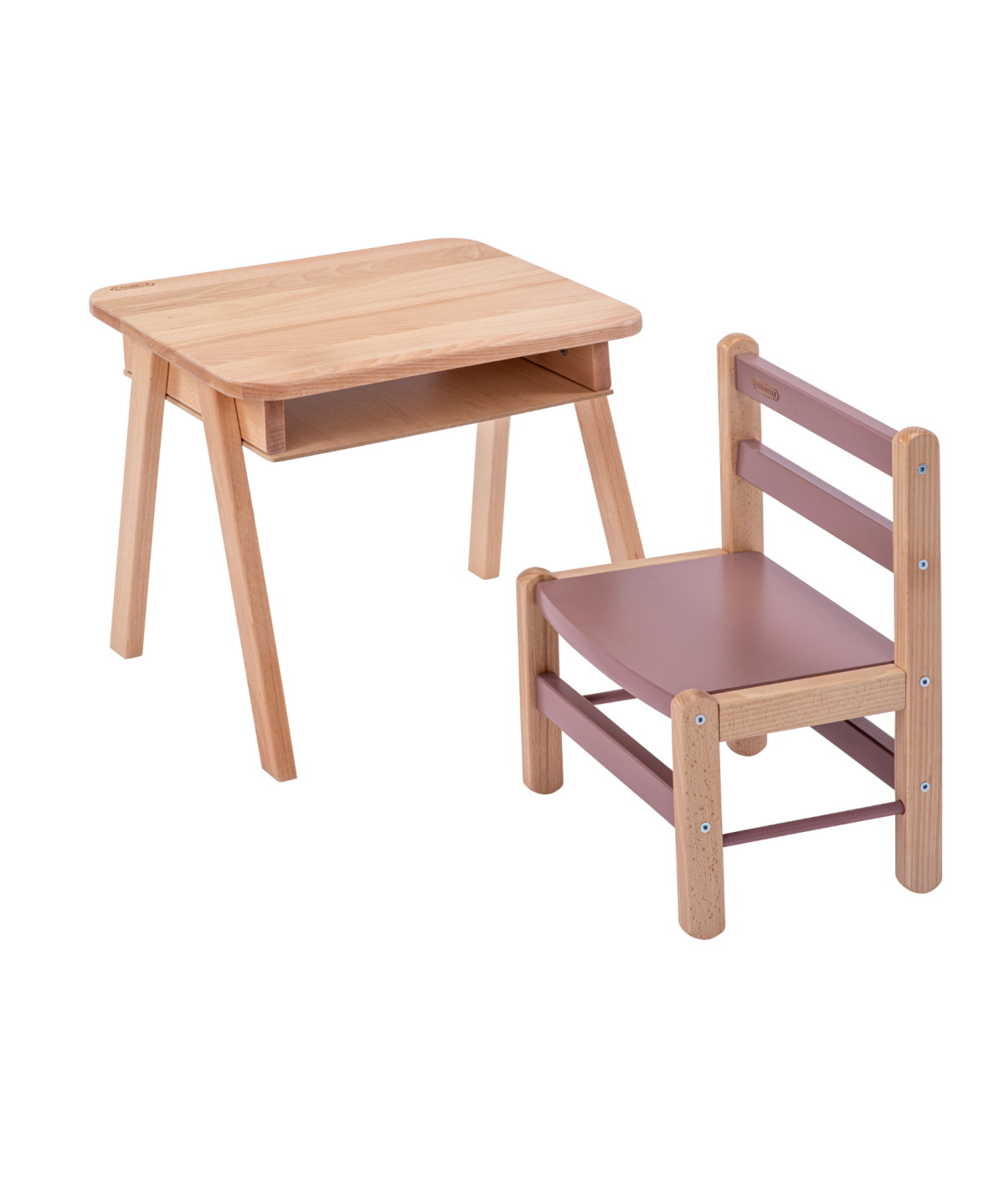 CARACTÉRISTIQUES : Bureau. Essence : hêtre massif, Finition : vernis naturel. Plateau : Hêtre massif. Dimensions : 49 cm x 39 cm, hauteur 42.5 cm. Charge maximale admissible sur le plateau : 30 kg. Chaise : pour enfant de 10 mois à 5 ans. Dimensions 27x33, hauteur 46cm. Essence : Hêtre massif. Charge maximale admissible sur la chaise : 20 kg