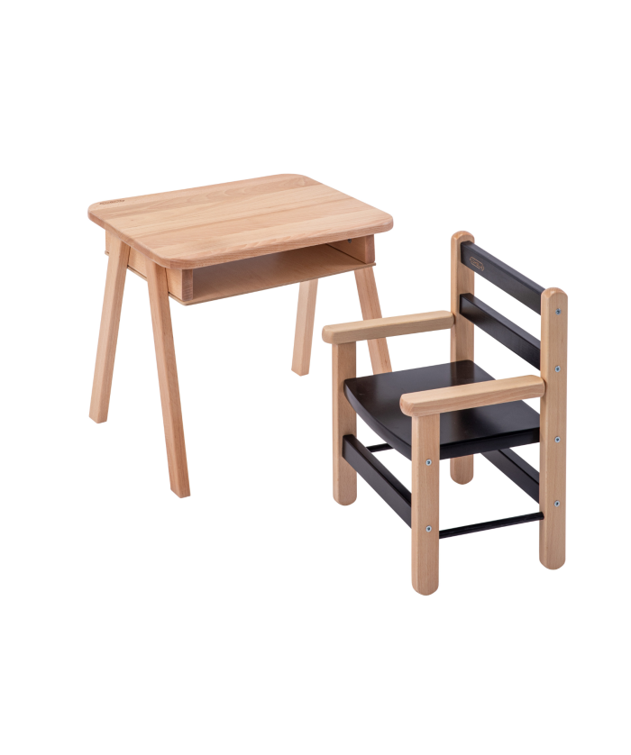 CARACTÉRISTIQUES : Bureau. Essence : hêtre massif, Finition : vernis naturel. Plateau : Hêtre massif. Dimensions : 49 cm x 39 cm, hauteur 42.5 cm. Charge maximale admissible sur le plateau : 30 kg. Fauteuil : pour enfant de 10 mois à 5 ans. Dimensions 27x33, hauteur 46cm. Essence : Hêtre massif. Charge maximale admissible sur le fauteuil : 20 kg