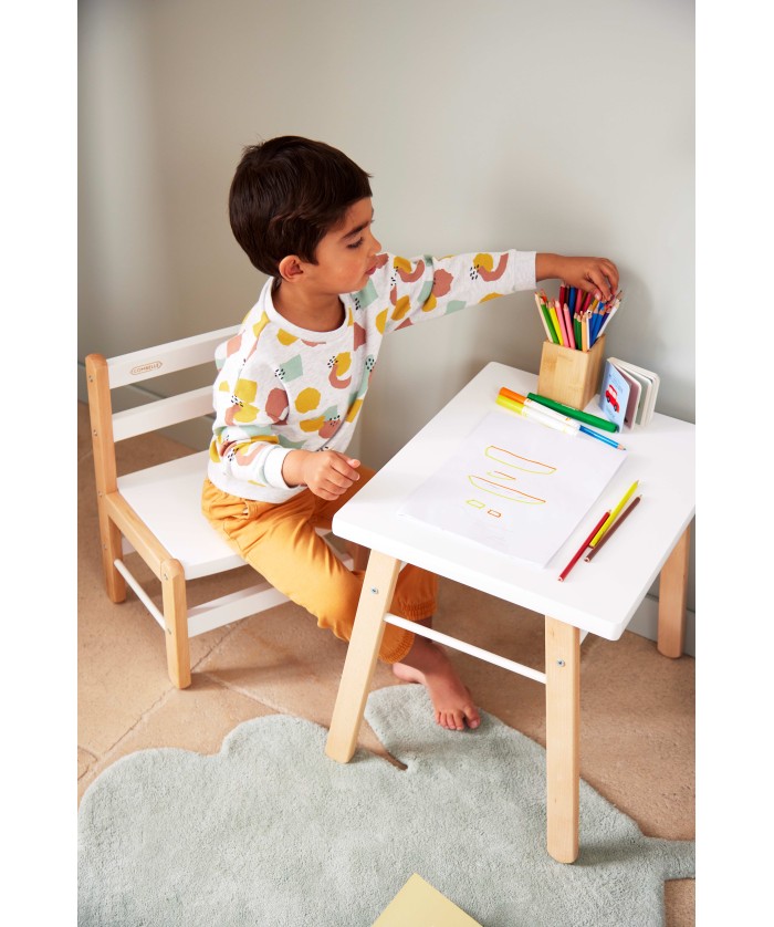 Son poids de seulement 2,3 kg permettra à bébé de la déplacer très facilement pour disposer son nouveau bureau en bois où il le souhaite. Légère et solide grâce à sa qualité de conception made in France vous pouvez être sûr qu’elle résistera aux coups et au mal menage de bébé. Étudiée pour les bébés et les petits, elle s’adaptera dès 10 mois et jusqu'à 5 ans