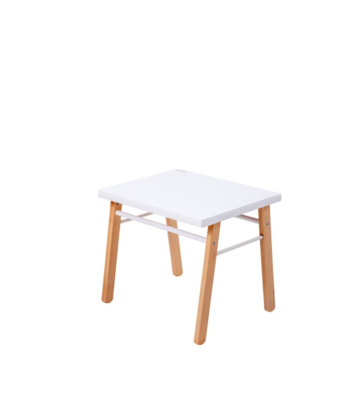 Table basse. Essence : hêtre massif, Finition : vernis naturel ou laquée. Plateau : médium imprimé qualité E1. Dimensions : 50 cm x 40 cm, hauteur 43 cm. Charge maximale admissible sur le plateau : 20 kg.