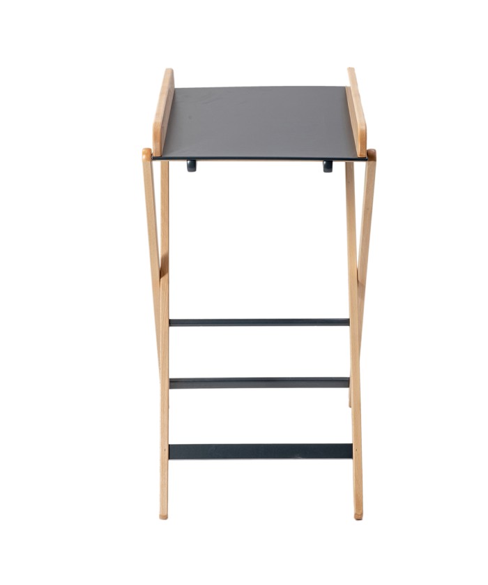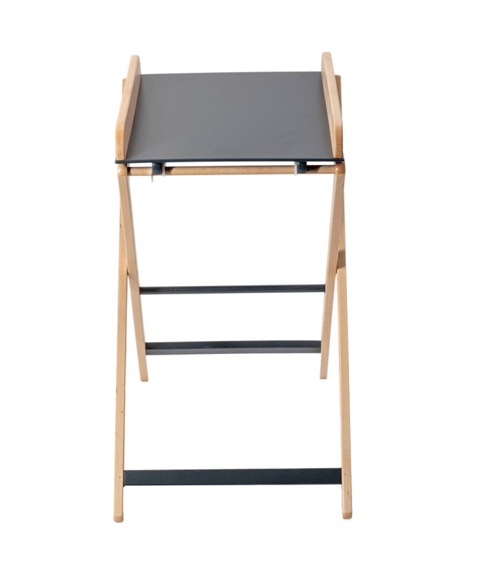 55 x 82 cm ; 2 hauteurs de réglage: 87 et 94 cm. Table pliée, épaisseur 14 cm